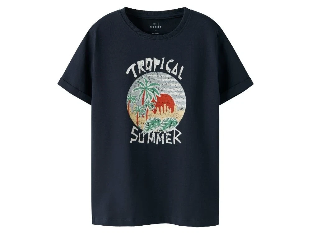 Mørkeblå kortærmet T-shirt med tropemotiv fra Name It 13237472 navy blazer tropical summer Mørkeblå kortærmet T-shirt fra Name It 13237472 navy blazer tropical summer Tropemotiv printet på mørkeblå kortærmet T-shirt fra Name It 13237472 navy blazer tropical summer