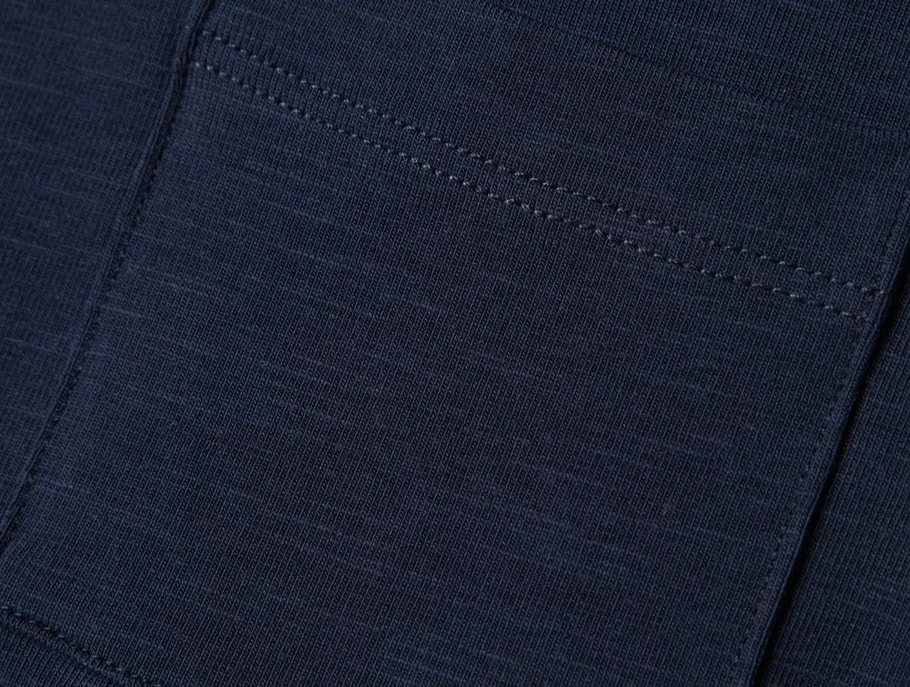 Klassisk t-shirt i mørkeblå med brystlomme. Modellen har rund hals med ribkant og korte ærmer, og den tætsiddende pasform gør den velegnet både alene og under andet tøj.