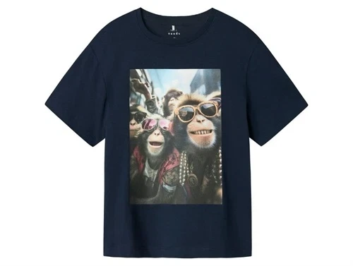 Blød og behagelig T-shirt fra Name It i en klassisk mørkeblå farve med et detaljeret foto-print af en abe. T-shirten er lavet af 100% bomuld i en let og strækbar jerseykvalitet, der sikrer høj komfort og bevægelsesfrihed.