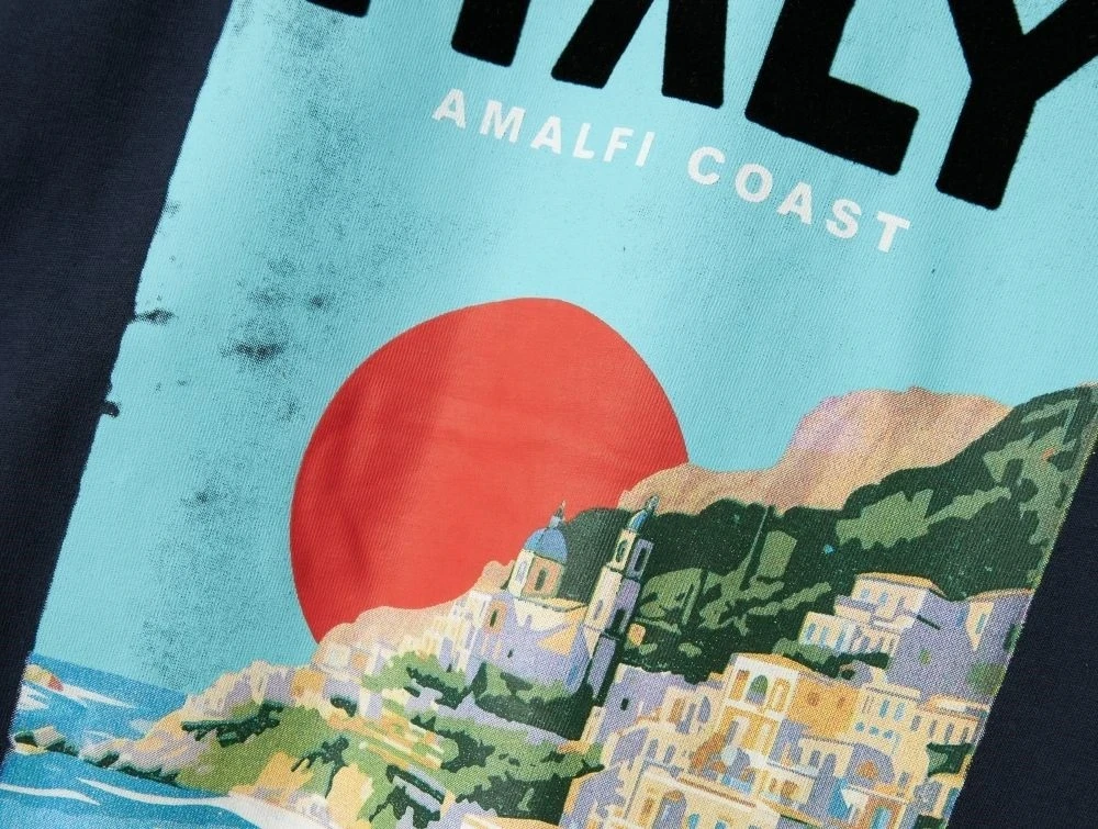 Mørkeblå t-shirt med stemningsfuldt gummiprint af Amalfikysten foran. Modellen har rund hals, korte ærmer og en klassisk pasform. Fremstillet i blød jerseykvalitet af økologisk og genanvendt bomuld, som føles behagelig mod huden og giver god bevægelighed – perfekt til både leg og hverdagsbrug.