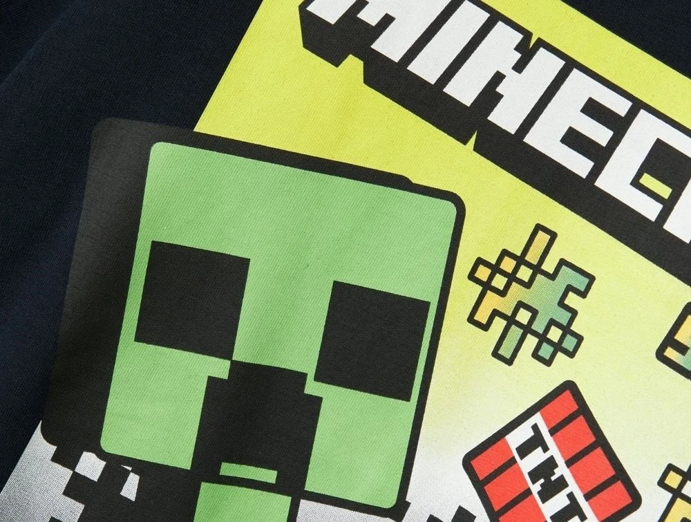 Modellen har en standard pasform, rund hals og korte ærmer. Printet er i gummi, hvilket giver en behagelig og blød overflade. Perfekt til små Minecraft-fans og nem at kombinere med jeans eller shorts til hverdagsbrug.
