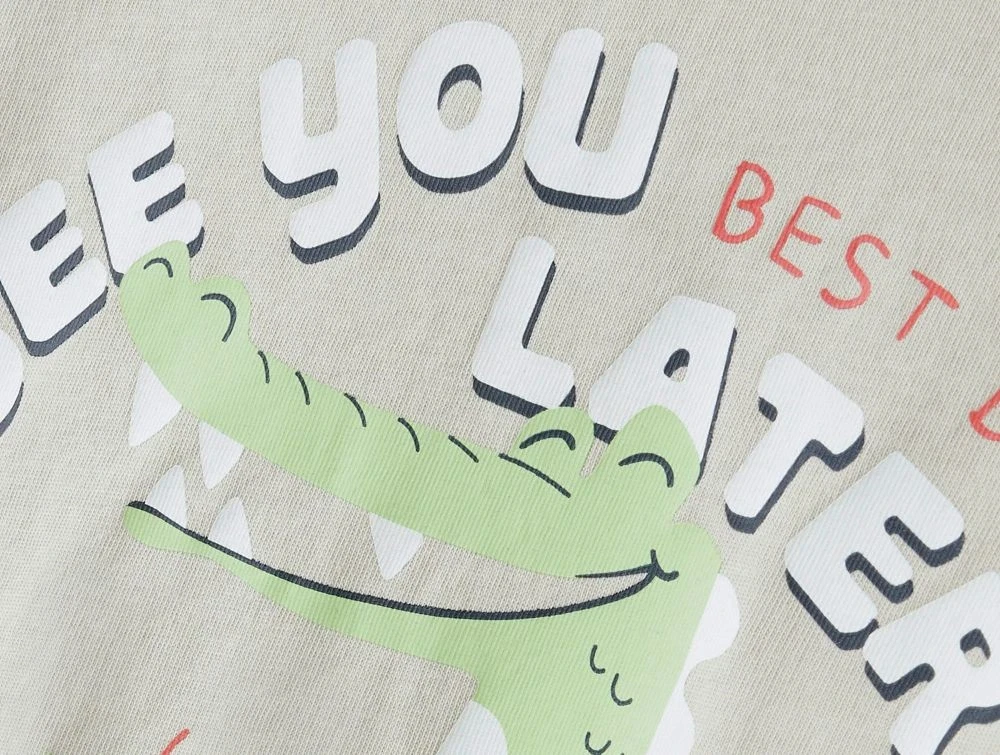 t-shirt fra Name It i beige med alligatorprint og tekstnærbillede af alligatorprint og tekst på beige Name It t-shirt