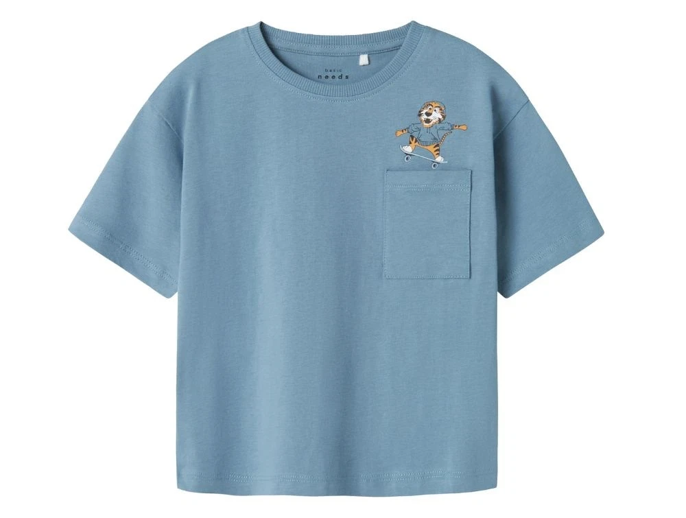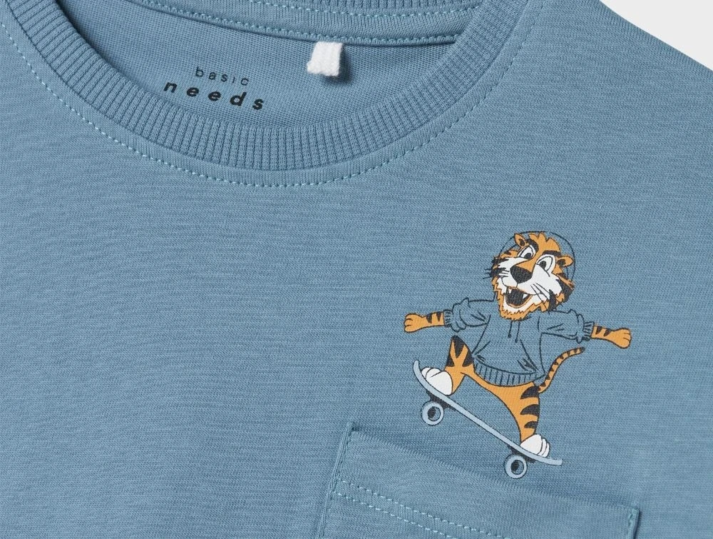 T-shirt i støvet blå (spring lake) fra Name It med lille brystlomme og et sjovt print af en tiger på skateboard.