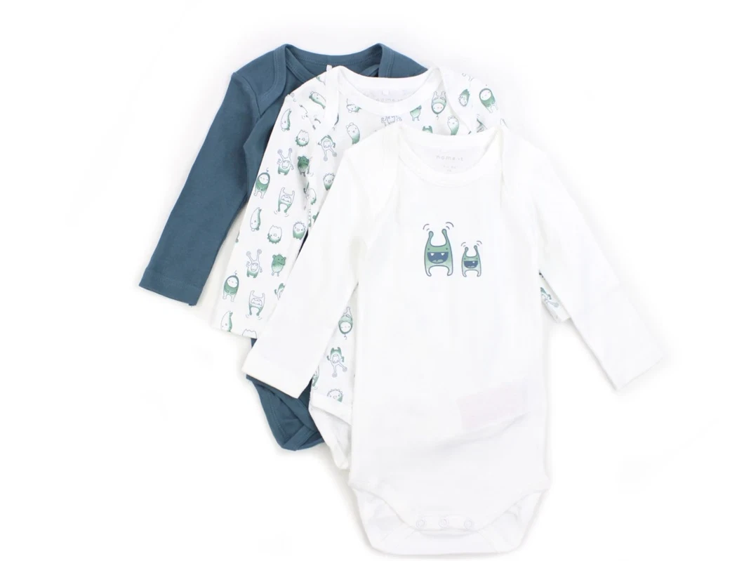 Den blå body er ensfarvet mens de to hvide bodyer har monsterprint.