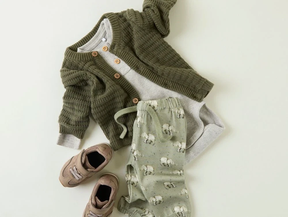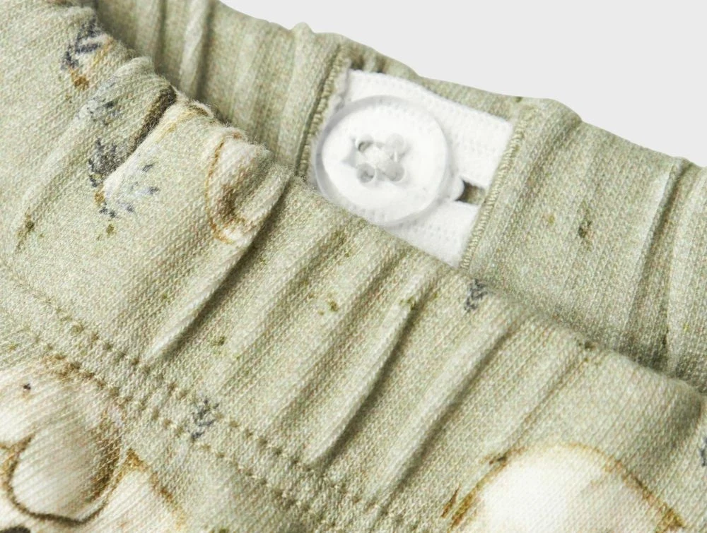Babybukser i farven tea med elefantprint fra Name It. Justerbar elastik i taljen. De er lavet af 57% økologisk bomuld, 38% TENCEL Lyocell og 5% elastan, hvilket giver en dejlig blød kvalitet. Maskinvaskes ved 40°.