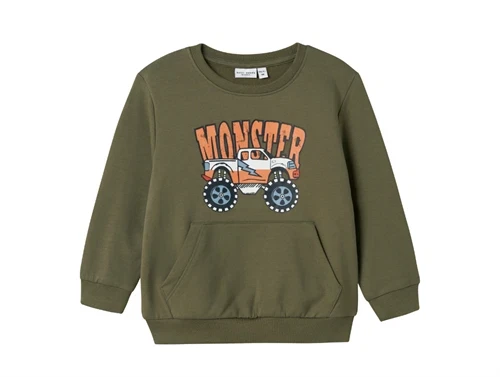 Sweatbluse i farven tea leaf med monster truck print fra Name It.
