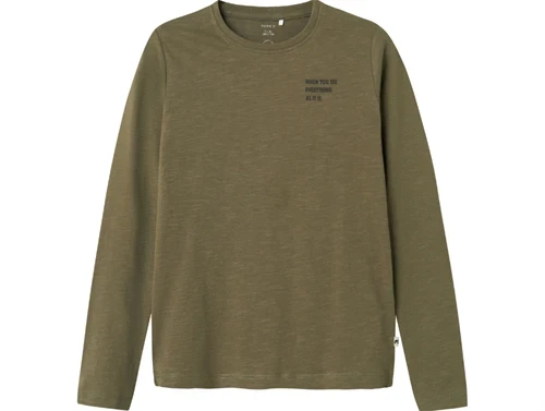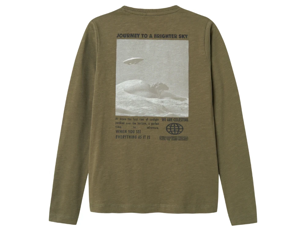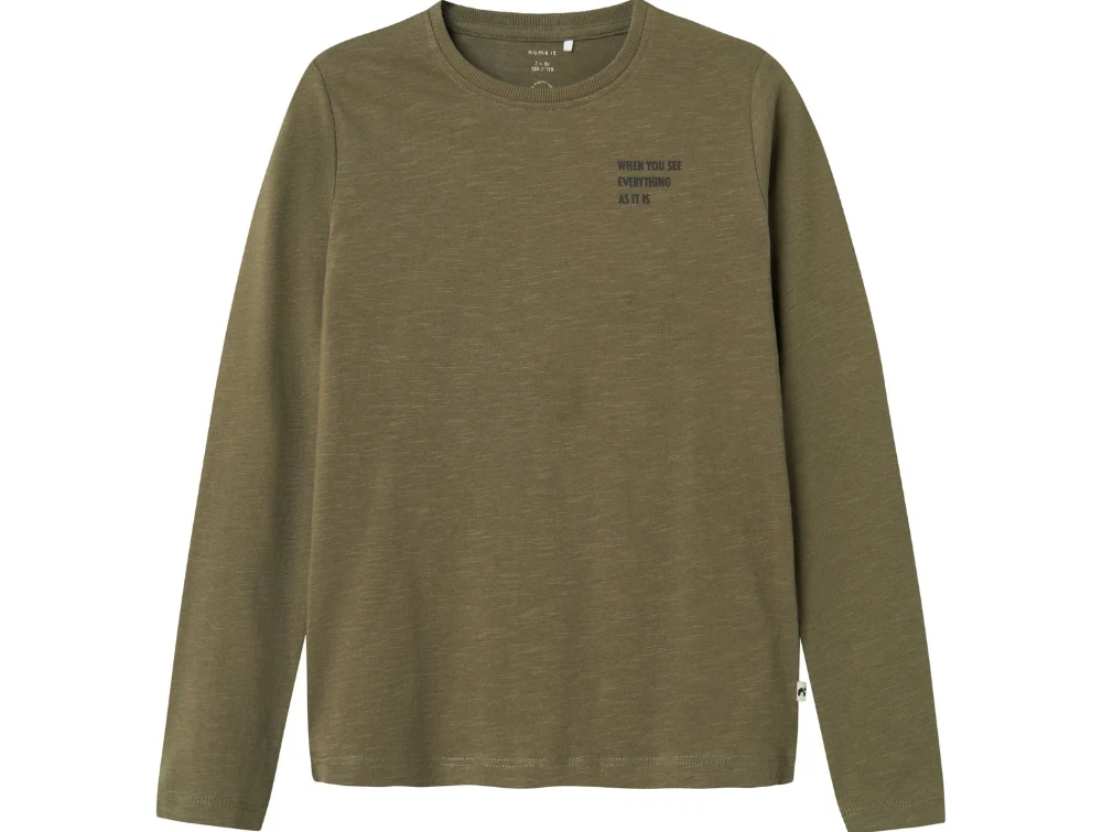 Langærmet bluse i farven tea leaf med lille tekstprint på front og print på ryg fra Name It.
