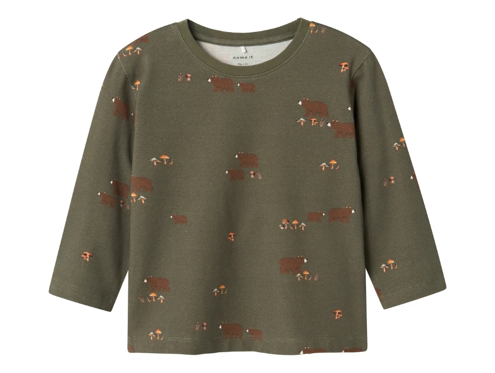 Langærmet top/bluse i farven tea leaf med svampe og bjørneprint fra Name It.