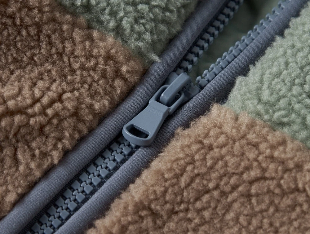 Jakken har høj stand-up krave, gennemgående lynlås og praktiske sidelommer. Den bløde teddyoverflade giver varme, mens lynlåsen har hagebeskytter, så huden ikke kommer i klemme. Kontrastpanelerne i støvede nuancer giver et sporty look, og jakken er nem at tage af og på i hverdagen.