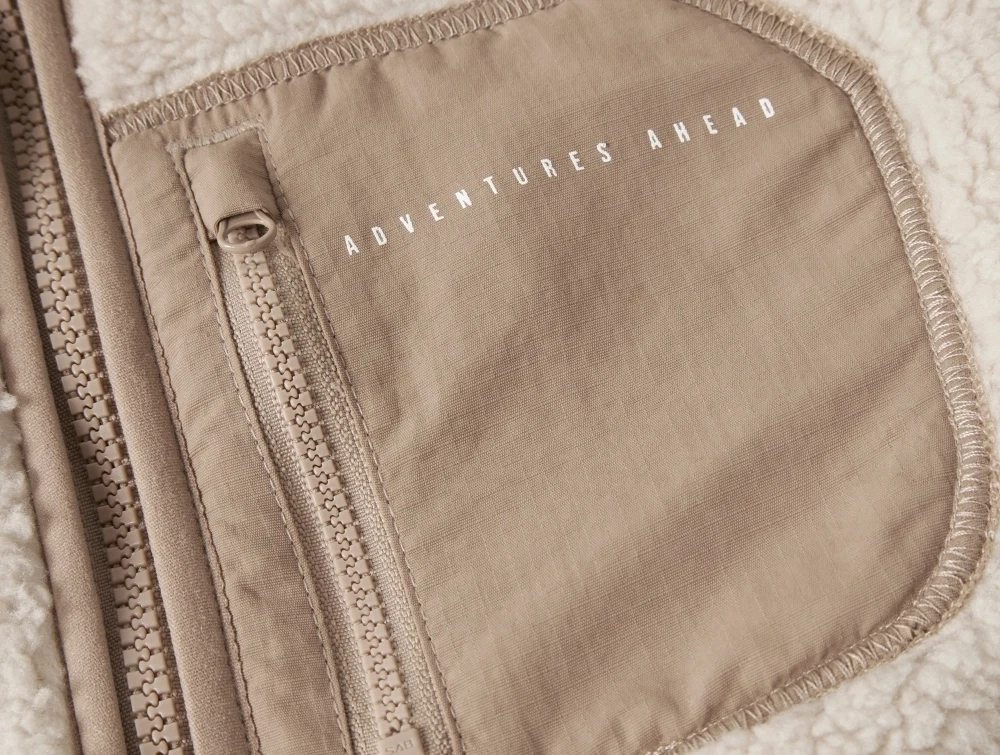 Name It teddy jakke i beige moonbeam med brystlomme foranDetalje af brystlomme med tekst Adventures Ahead på Name It teddy jakkeLynlåsdetalje og hals på beige teddy jakke fra Name ItName It teddy jakke moonbeam vist bagfra