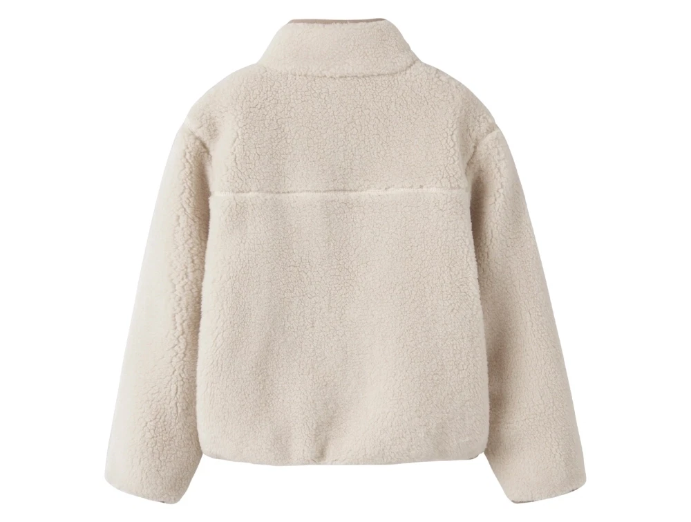 Teddy jakke i lys beige nuance fra Name It med blød teddy kvalitet og funktionelle detaljer.