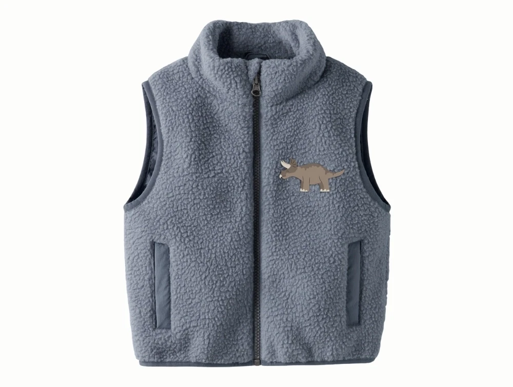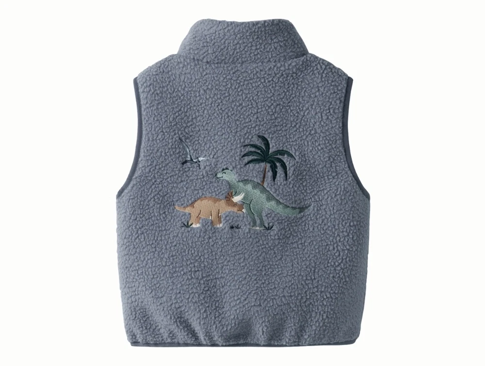 Denne fleecevest kombinerer klassisk teddy-look med legende detaljer. Gileten lukkes med lynlås foran og har praktiske sidelommer. På ryggen ses et større broderi med dinosaurer og palme, som giver et tydeligt og genkendeligt udtryk. Kan bruges både indendørs som ekstra lag og udendørs som let overtøj.
