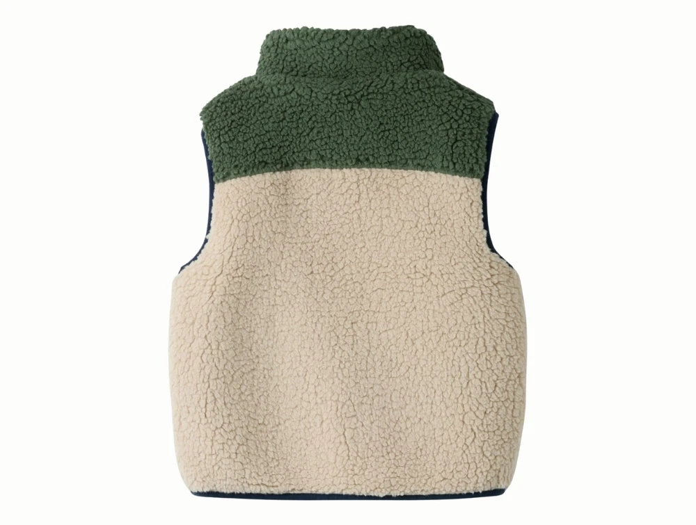 Teddy vest i beige (peyote), grøn og blå fra Name It med blød og fluffy overflade, der giver et varmt og behageligt lag til overgangsperioder.