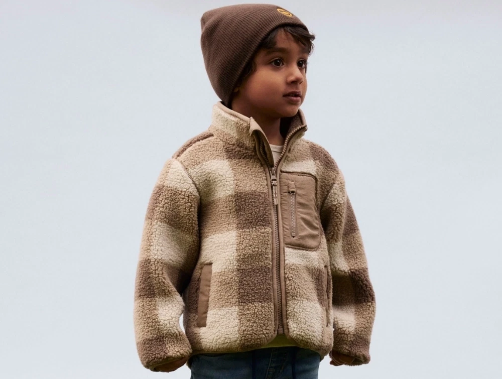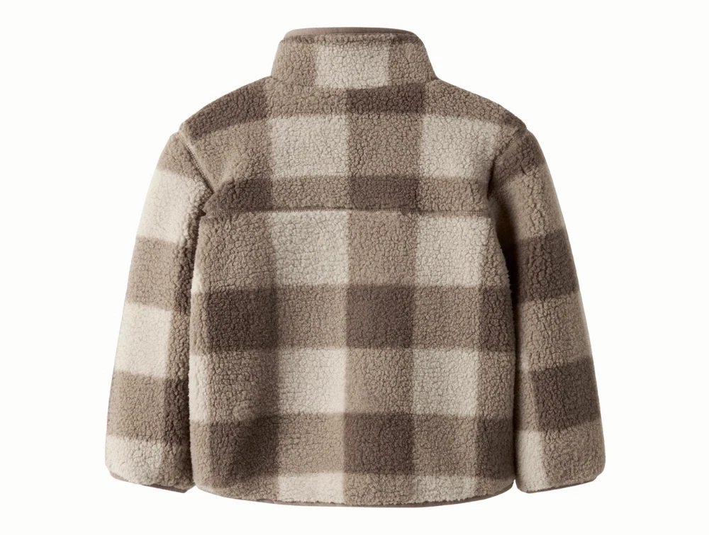Name It teddyjakke i ternet brun nuance på barnName It teddyjakke i brun og beige ternName It teddyjakke med brystlomme og lynlåsName It teddyjakke set bagfra i ternet brun nuance