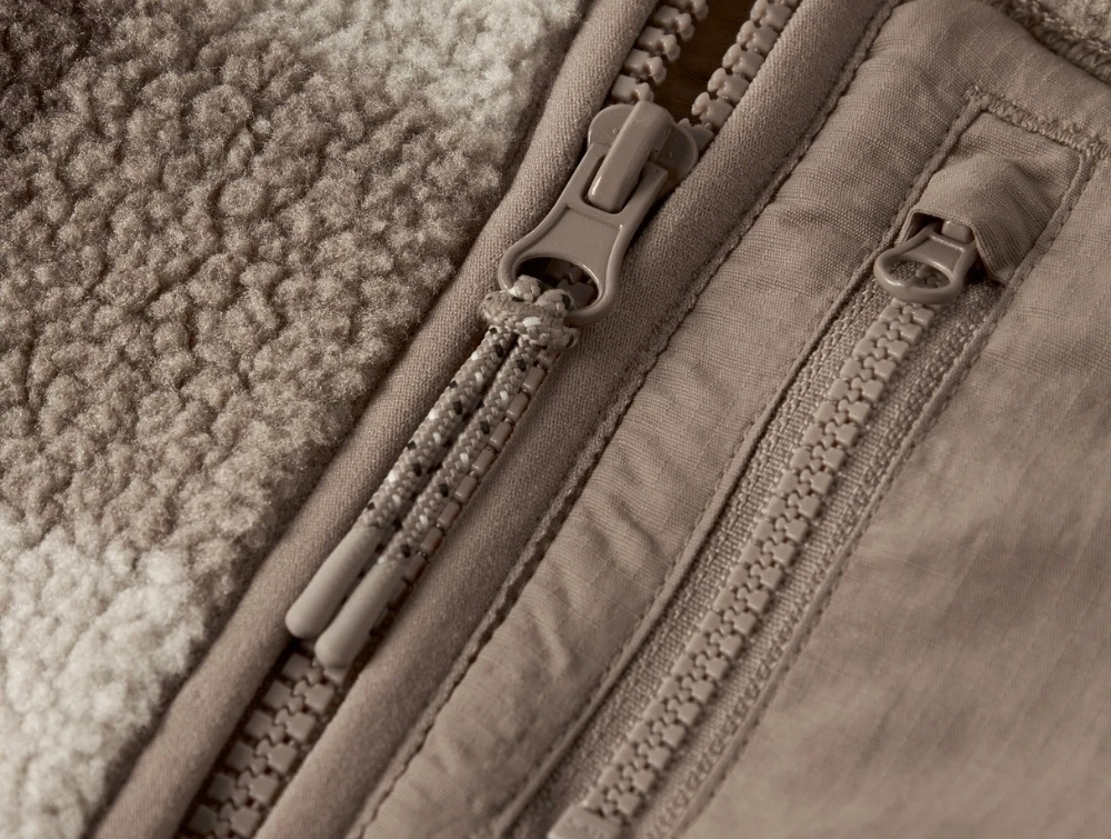 Jakken har en blød og vamset overflade med kontrastpanel på brystet samt praktisk lynlåslomme. Den ternede struktur giver et klassisk udtryk, mens teddy kvaliteten tilfører let varme.