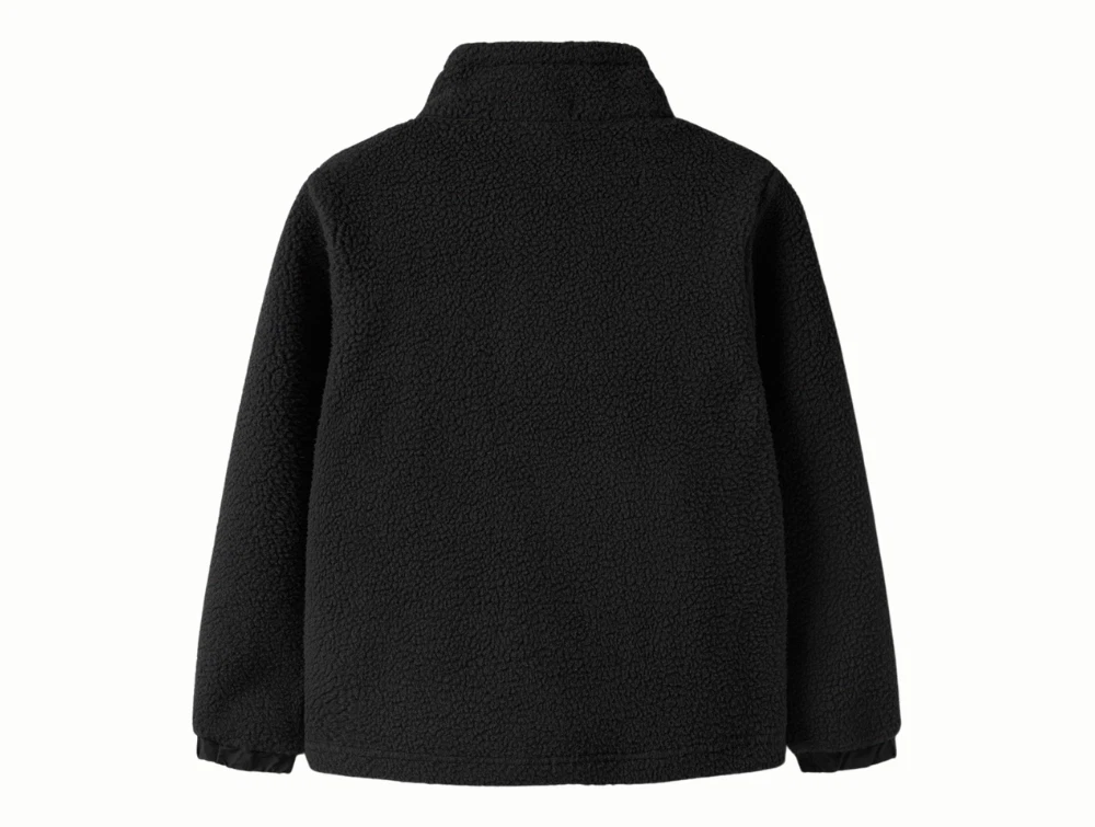 Name It teddyjakke i sort med brystlomme  Name It teddyjakke i sort på model  Name It teddyjakke i sort med lynlåslomme detalje  Name It teddyjakke i sort set bagfra