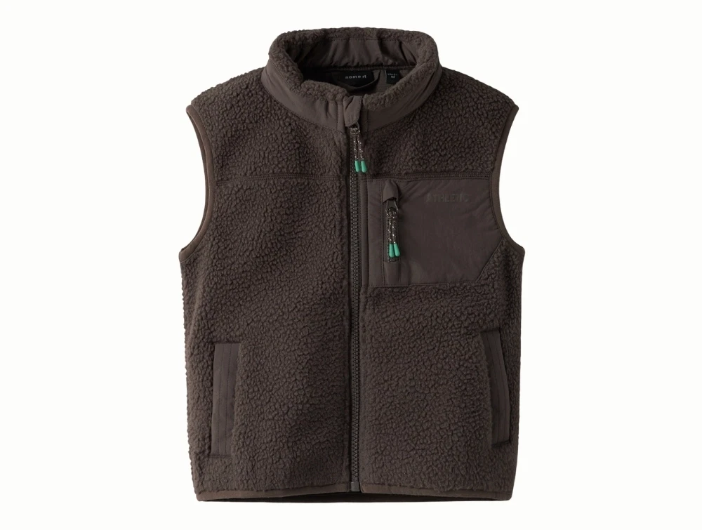 Teddyvest i brun nuance (chocolate brown) fra Name It med blød og vamset overflade.