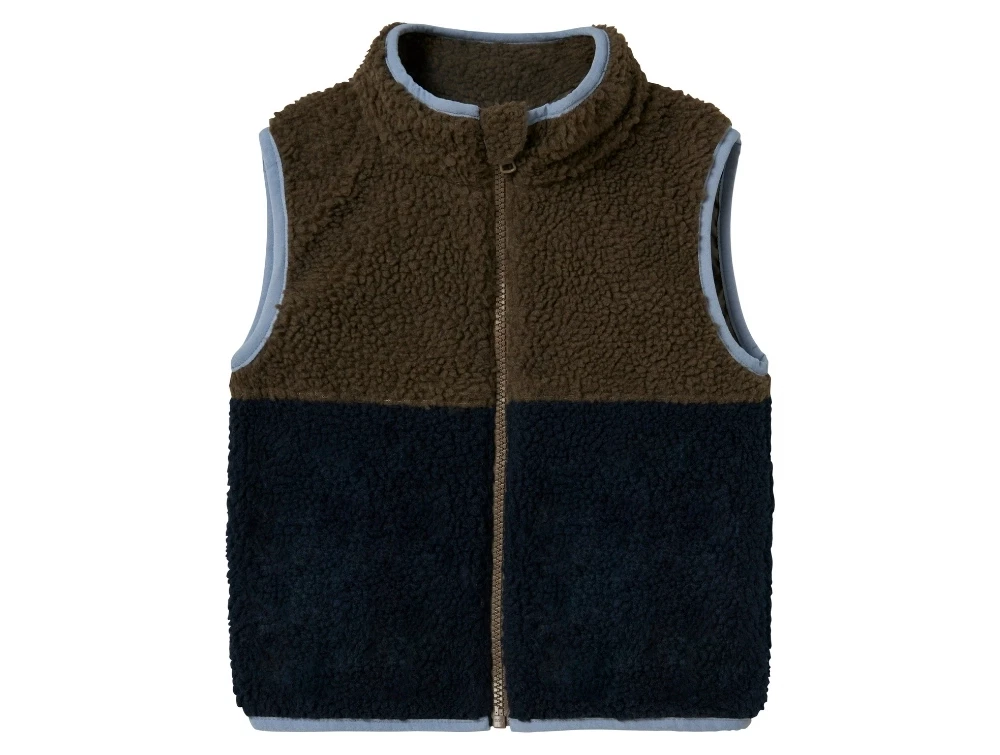 Name It teddyvest i morel og navy med høj hals forsideName It teddyvest i morel og navy bagsideDetalje af krave på Name It teddyvest i morel og navy