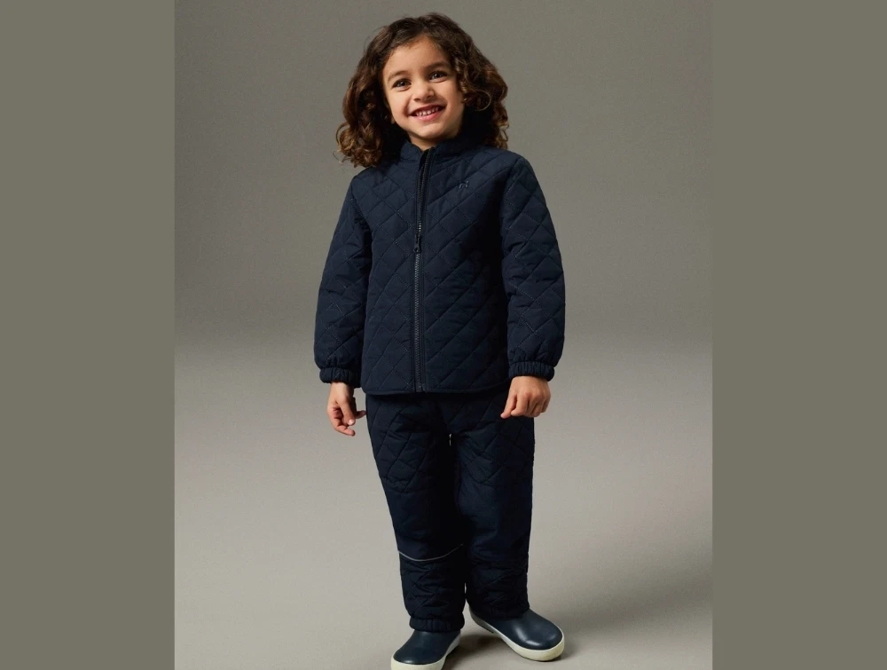 Det quiltede termomateriale giver en let isolering, der holder barnet lunt uden at virke tungt. Overfladen er vandafvisende og gør sættet anvendeligt i skiftende vejrforhold.