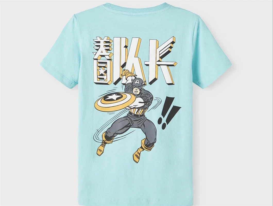 T-shirt i farven tibetan stone med lille Marvel logoprint på front og print af Captain America på ryggen fra Name It.