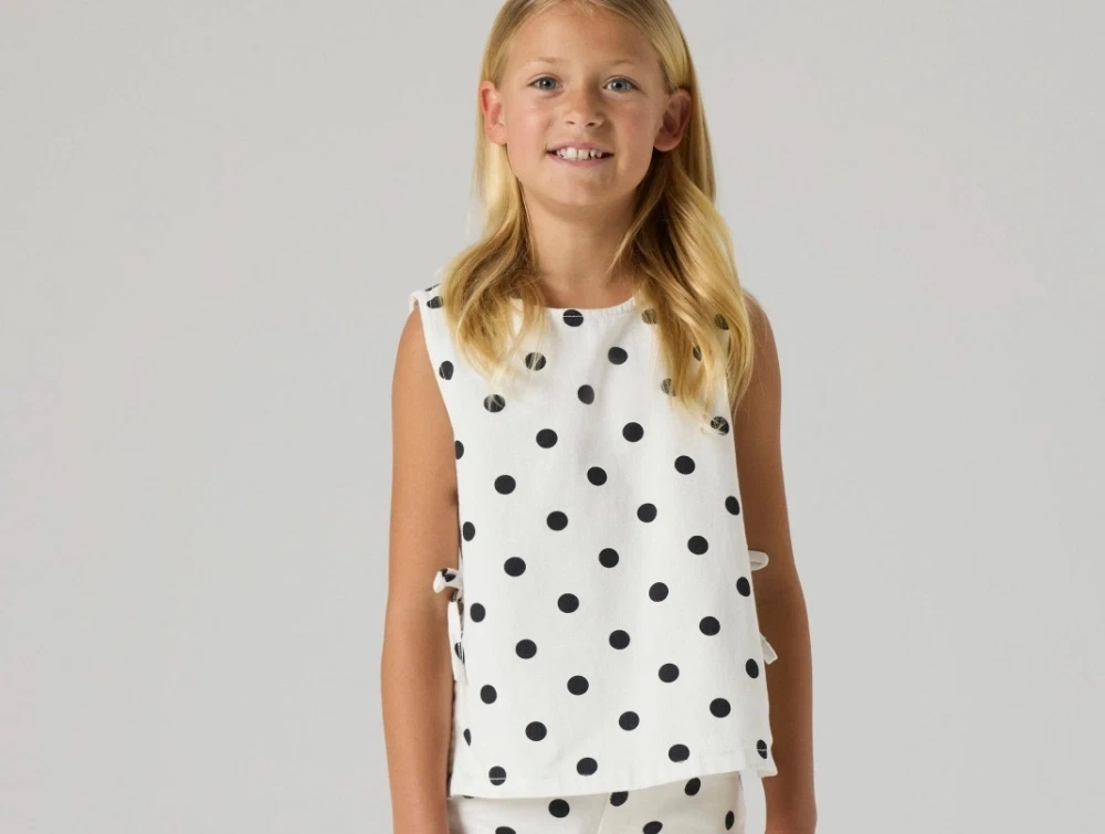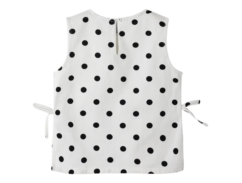 Designet har rund hals, ærmeløst snit og lukkes med knap og løkke i nakken. På siderne er der fine bindebånd, som giver et justerbart udtryk. Toppen har almindelig pasform og et print med prikker over hele overfladen.