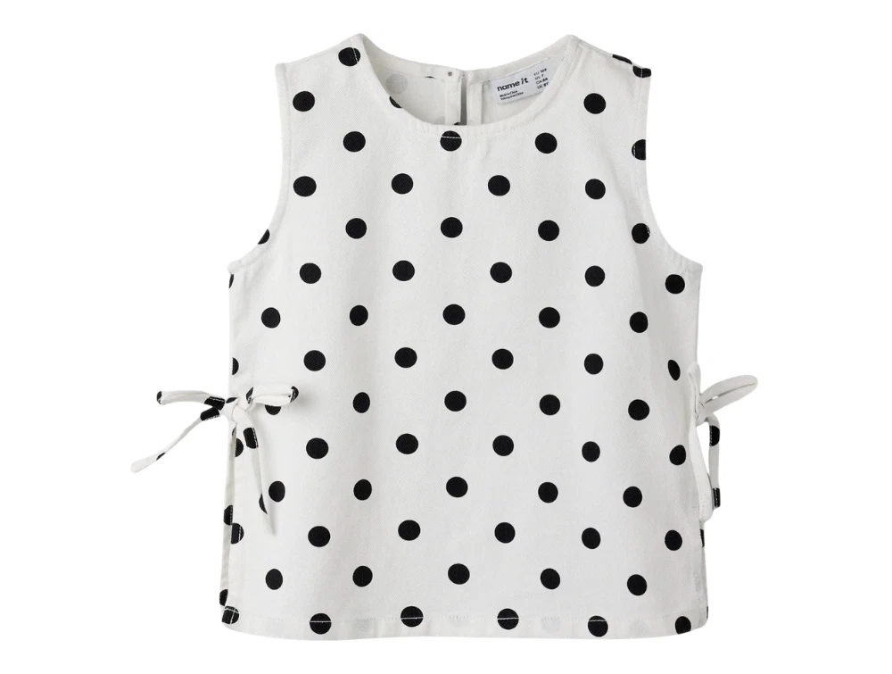 Name It top i antique white med sorte prikker set på modelName It top i antique white med sorte prikker forfraName It top i antique white med sorte prikker detalje af sløjfeName It top i antique white med sorte prikker bagfra