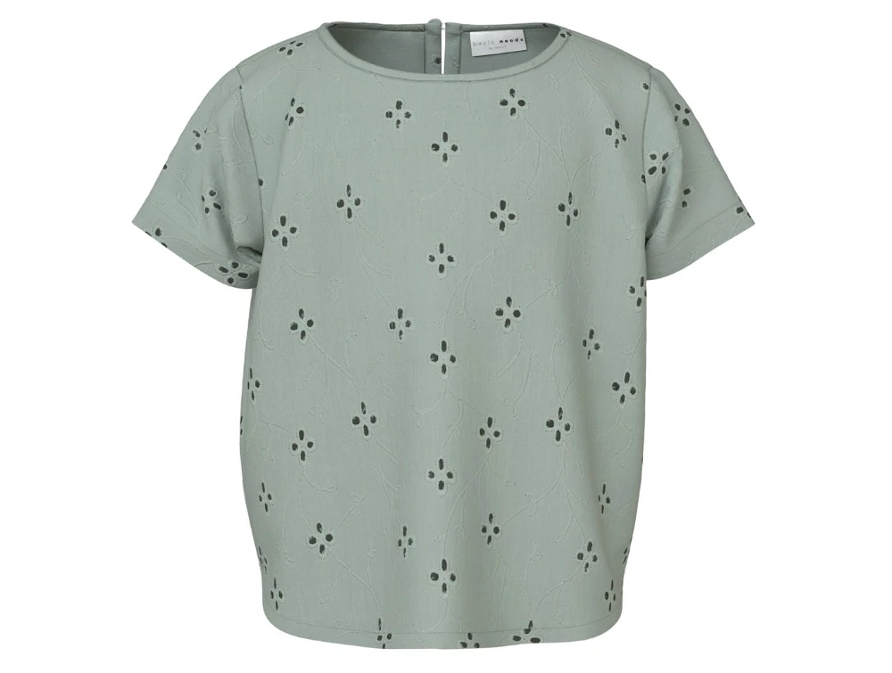 Top i grøn nuance (aqua gray) fra Name It. Let vævet kvalitet med broderet blomsterstruktur og knaplukning bagpå. Designet med korte ærmer og rund hals.