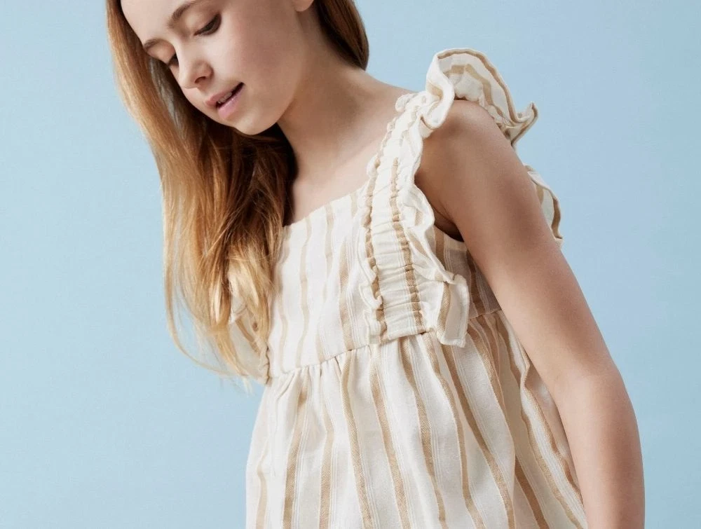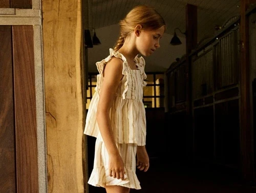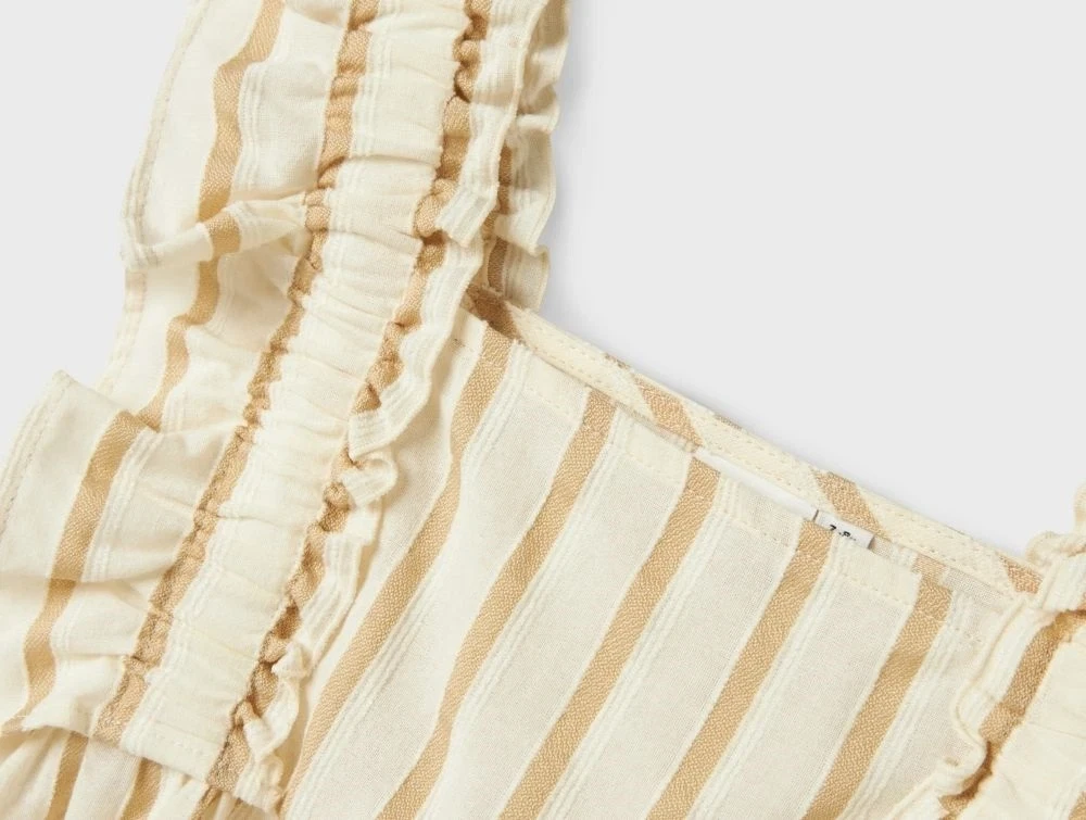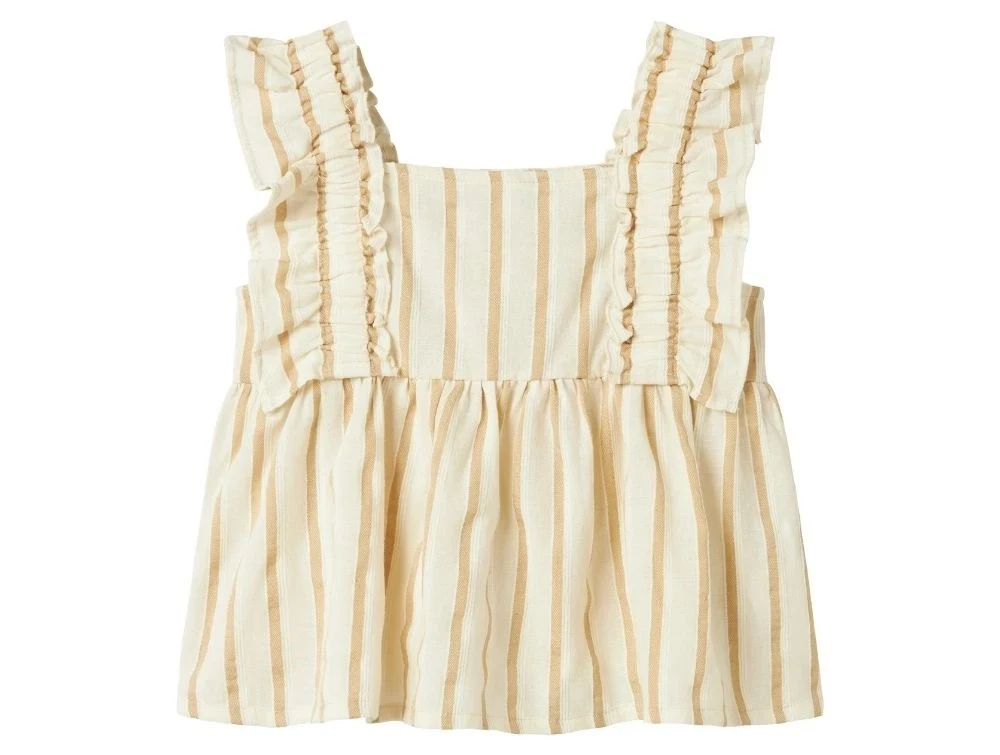Toppen er designet til børn og har en regulær pasform, firkantet halsudskæring og små ærmer. Det vævede stof med fine striber giver toppen et rent og sommerligt udtryk, perfekt til solrige dage og lyse aftener.