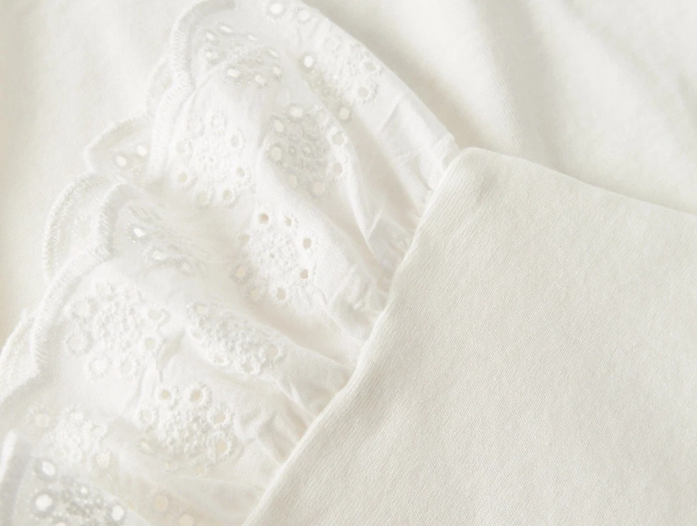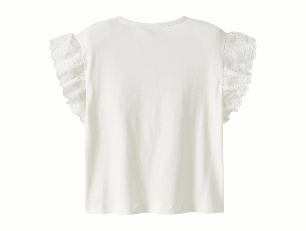 Modellen har korte flæseærmer med fine broderede detaljer og rund hals.