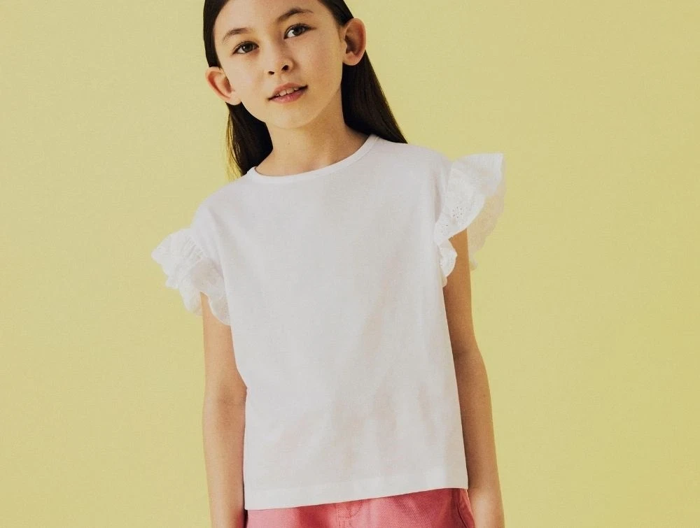 Toppen er lavet i blød jerseykvalitet med rund hals og korte ærmer med flæser. Pasformen er almindelig og stoffet er strækbart, så barnet har god bevægelsesfrihed.