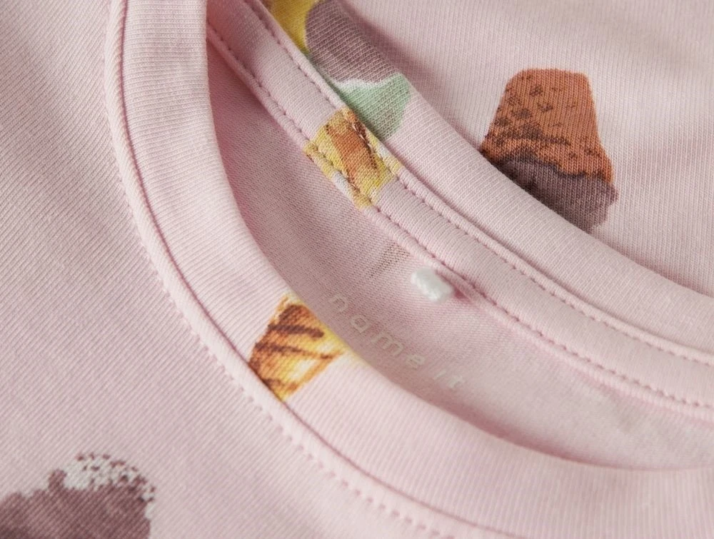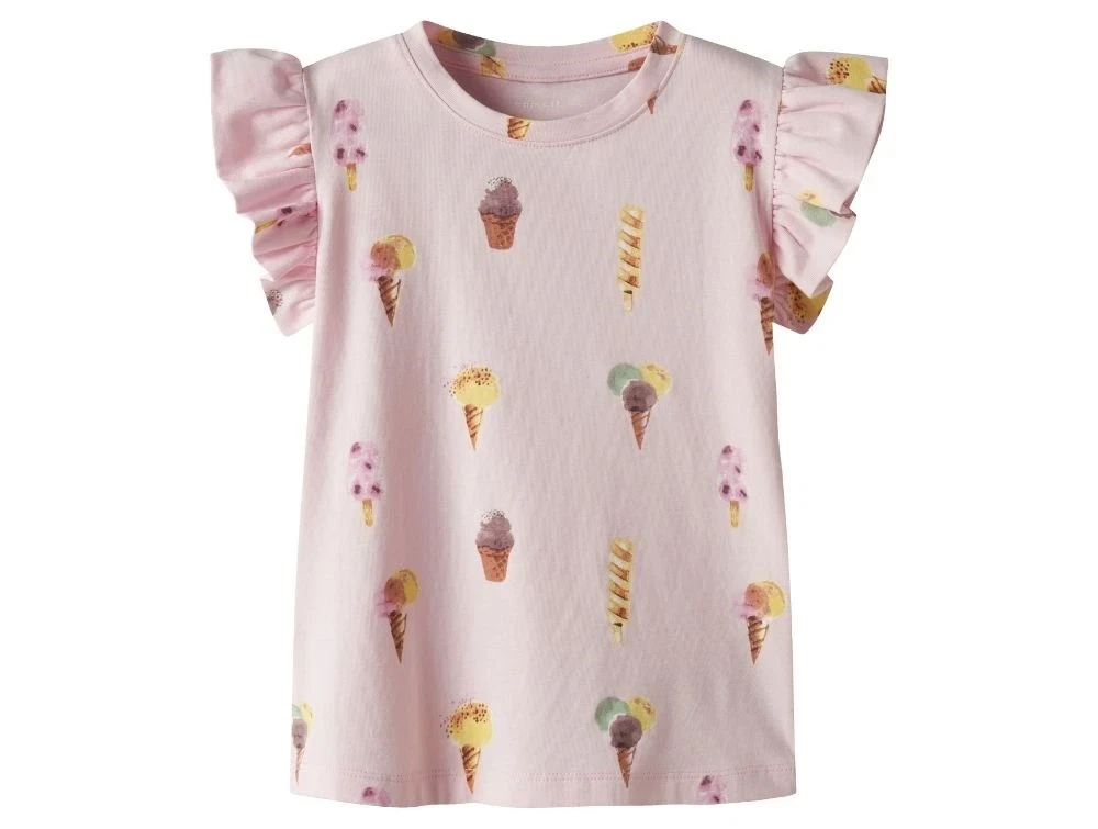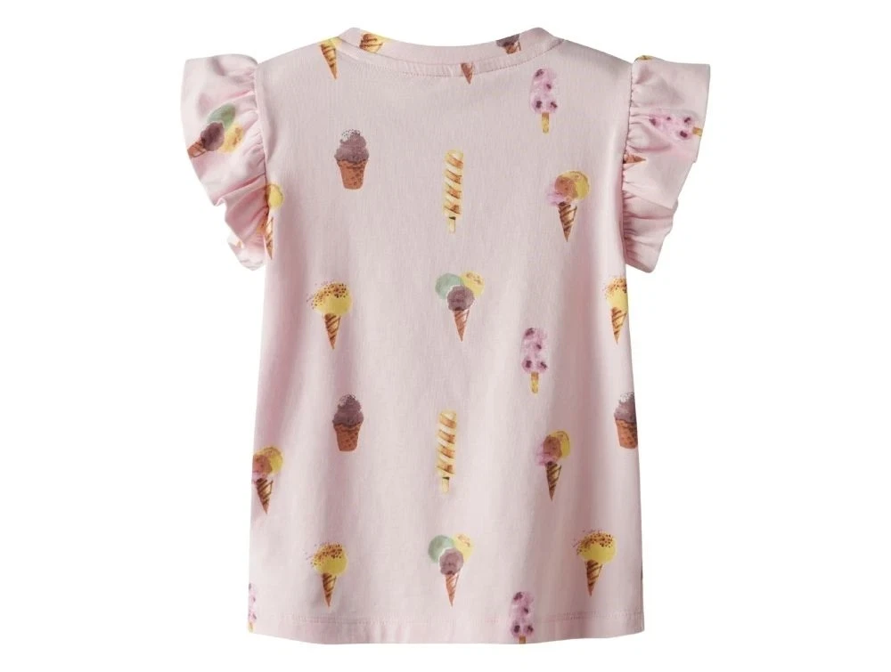 Toppen har et skønt print med akvarel-lignende ispinde og vafler i fine farver. Modellen har rund hals og en flæse med rynk, hen over hver af skuldrene. Den er lavet i en blød og strækbar jerseykvalitet med økologisk bomuld og elastan, som giver en behagelig og fleksibel pasform.