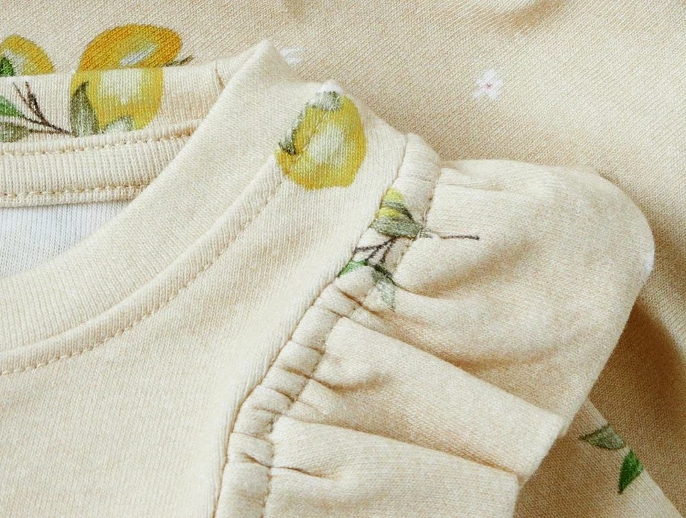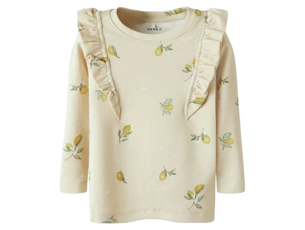 Top i farven peyote fra Name It med fint frugt- eller bærprint og flæsedetaljer på skuldrene.
