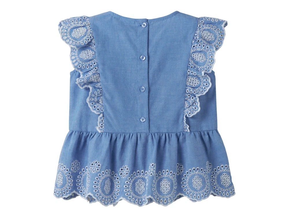 Name It top i blå nuance med broderie anglaise og flæserName It top purple impression broderie anglaise detaljeName It top purple impression bagside med knapper