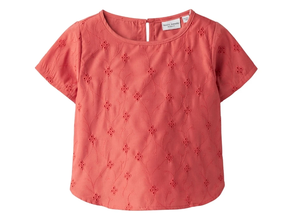 Top i varm koral nuance (spiced coral) fra Name It. Modellen har korte ærmer og er dekoreret med et smukt broderie anglaise mønster.
