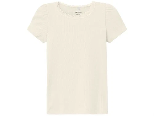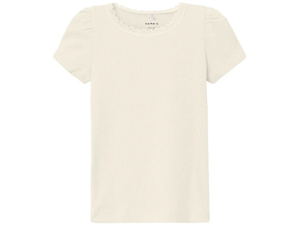Kortærmet top i råhvid (summer sand) med blonde ved halsåbning fra Name It.