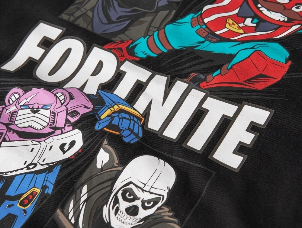 Designet har korte ærmer, rund hals og et stort print på fronten med figurer og grafik fra Fortnite. Fortnite er et populært spilunivers med action og karakterer, som mange børn kender. T-shirten har almindelig pasform.