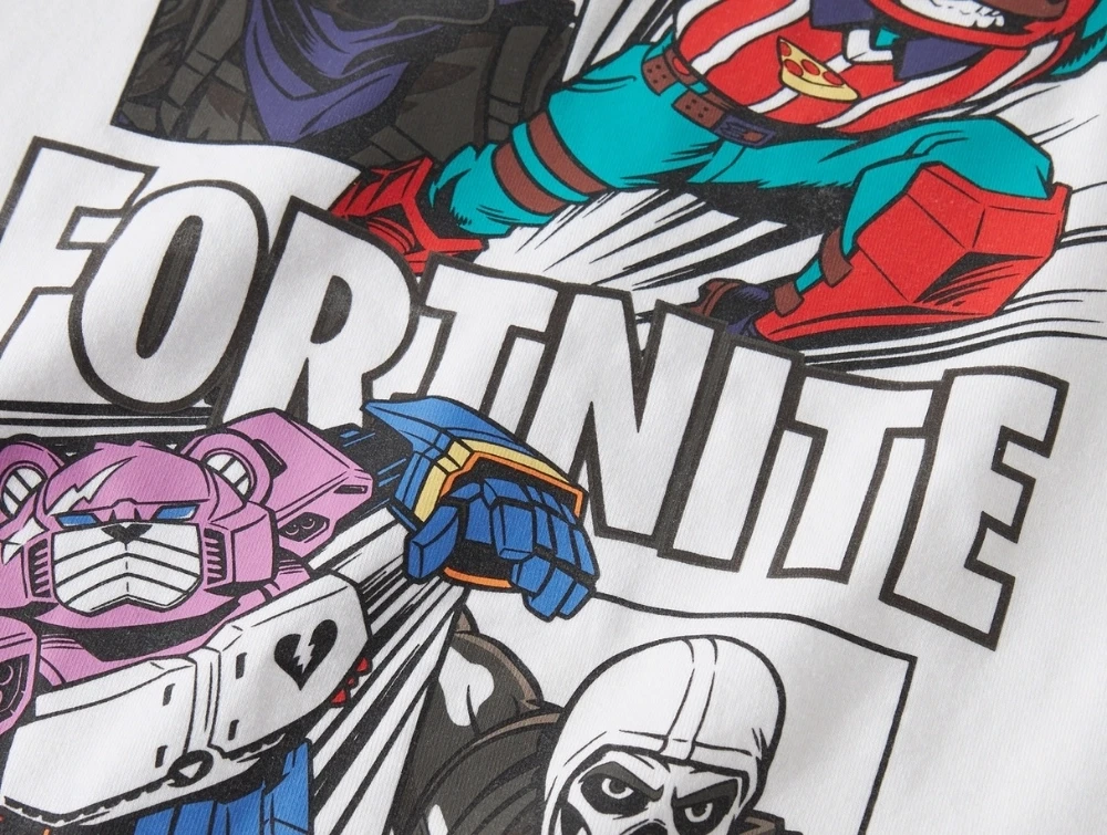 Designet har korte ærmer, rund hals og et stort print på fronten med figurer og grafik fra Fortnite. Fortnite er et populært spilunivers med action og karakterer, som mange børn kender. T-shirten har almindelig pasform.