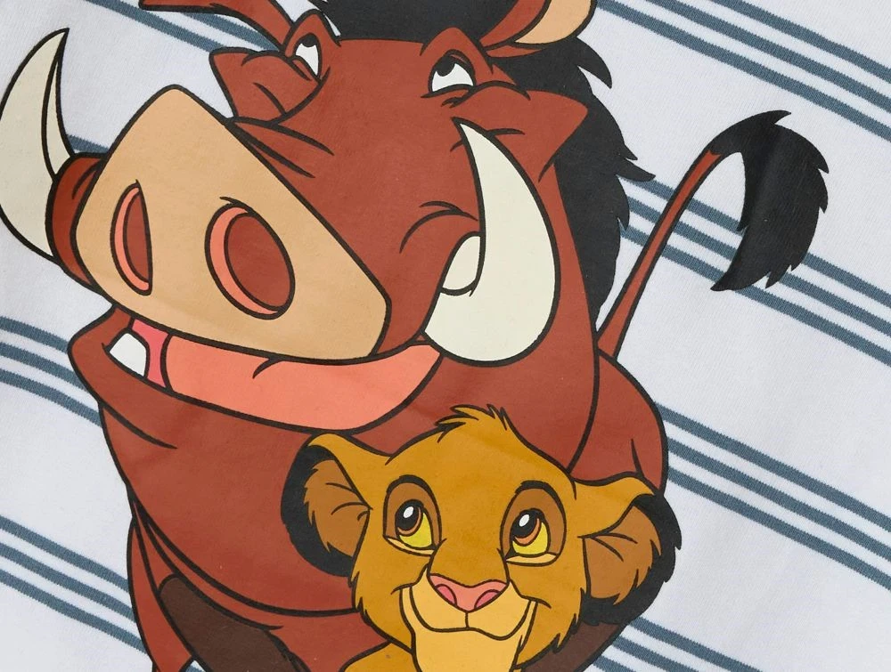Hvid og blåstribet t-shirt fra Name It med Løvernes Konge motivNærbillede af Simba og Pumbaa motiv på Name It t-shirt
