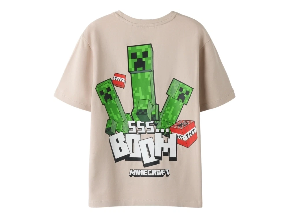 Designet har korte ærmer, rund hals og et print på fronten med figurer fra Minecraft. Minecraft er et populært spilunivers, hvor man kan bygge og udforske i en blokbaseret verden. T-shirten har almindelig pasform.