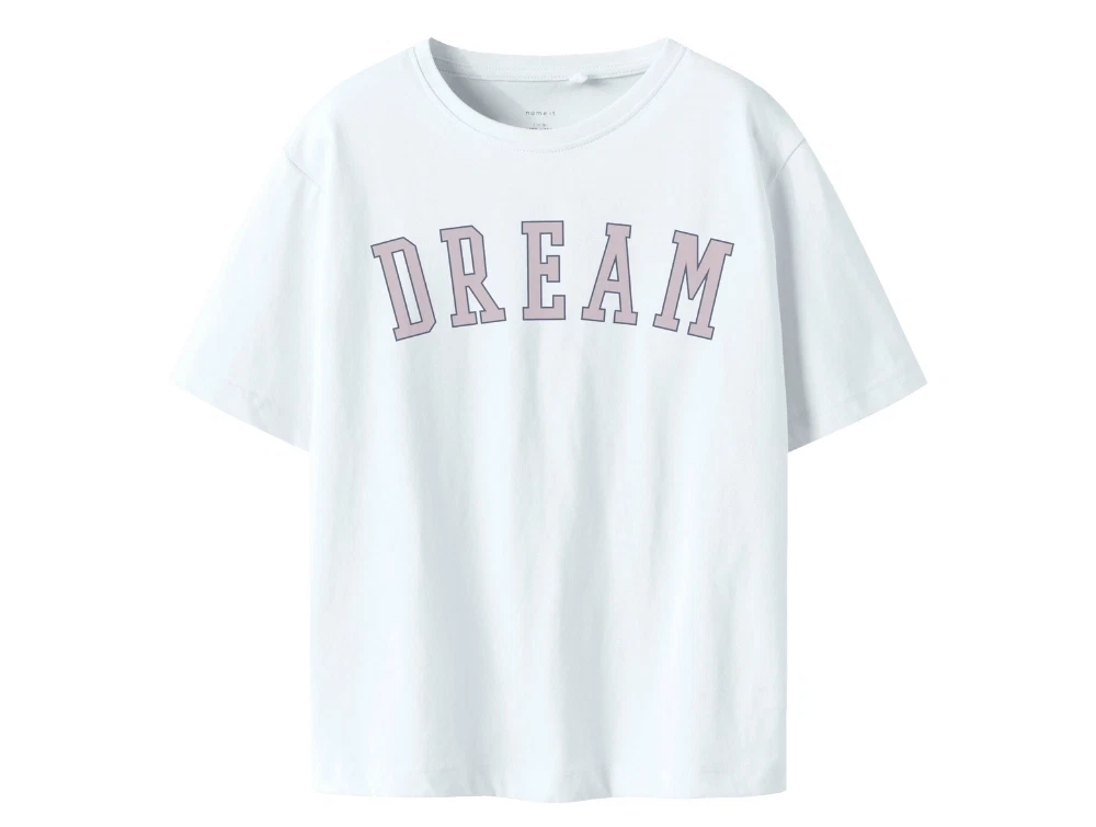 Modellen har et flot “DREAM” print på brystet i lyserøde bogstaver og er lavet i blød, økologisk bomuld med rund hals og korte ærmer.