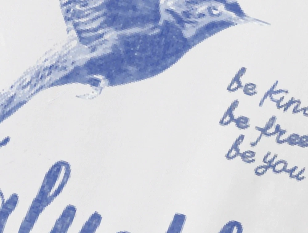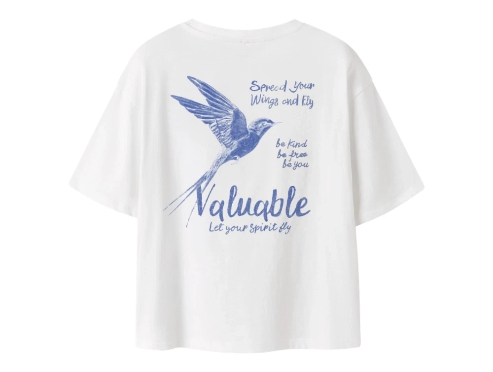 På brystet ses et mindre print med fugl og teksten “Valuable”, mens bagsiden har et større motiv med fugl og tekst.