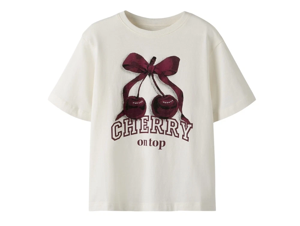 T-shirt i råhvid nuance fra Name It med stort kirsebærprint og små sten-detaljer foran.