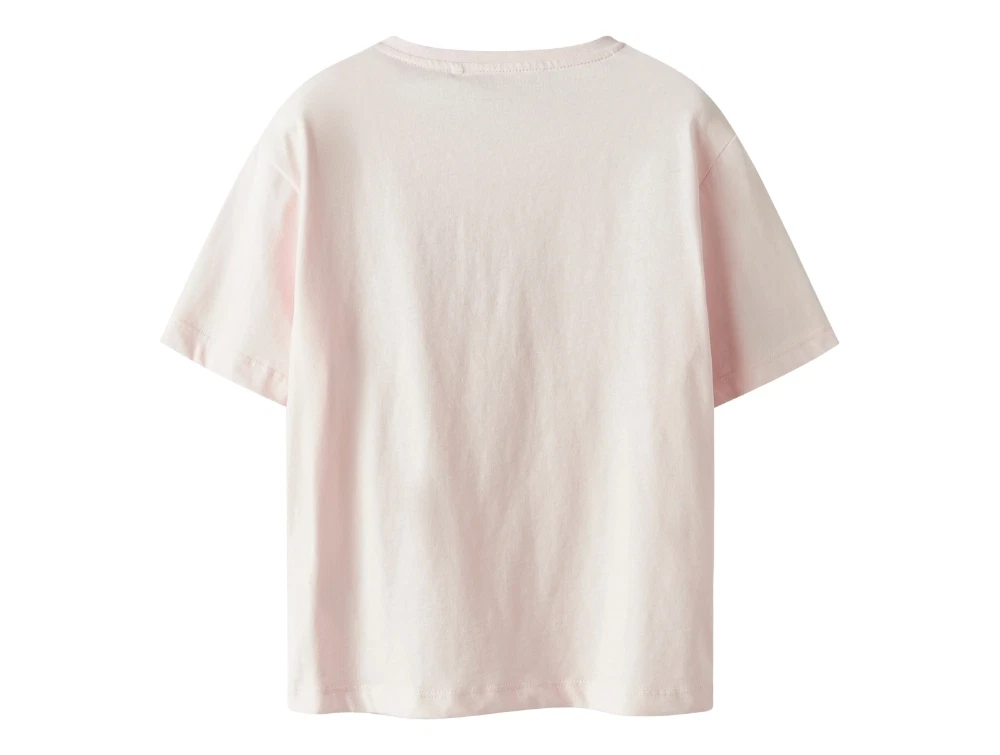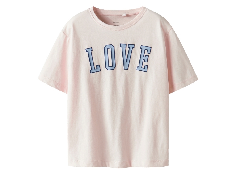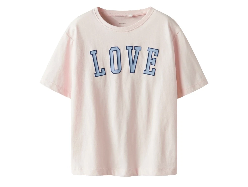 t-shirt fra Name It i lyserød med love printpige iført lyserød Name It t-shirt med love printdetalje af love print på t-shirt fra Name Itbagside af lyserød t-shirt fra Name It uden print
