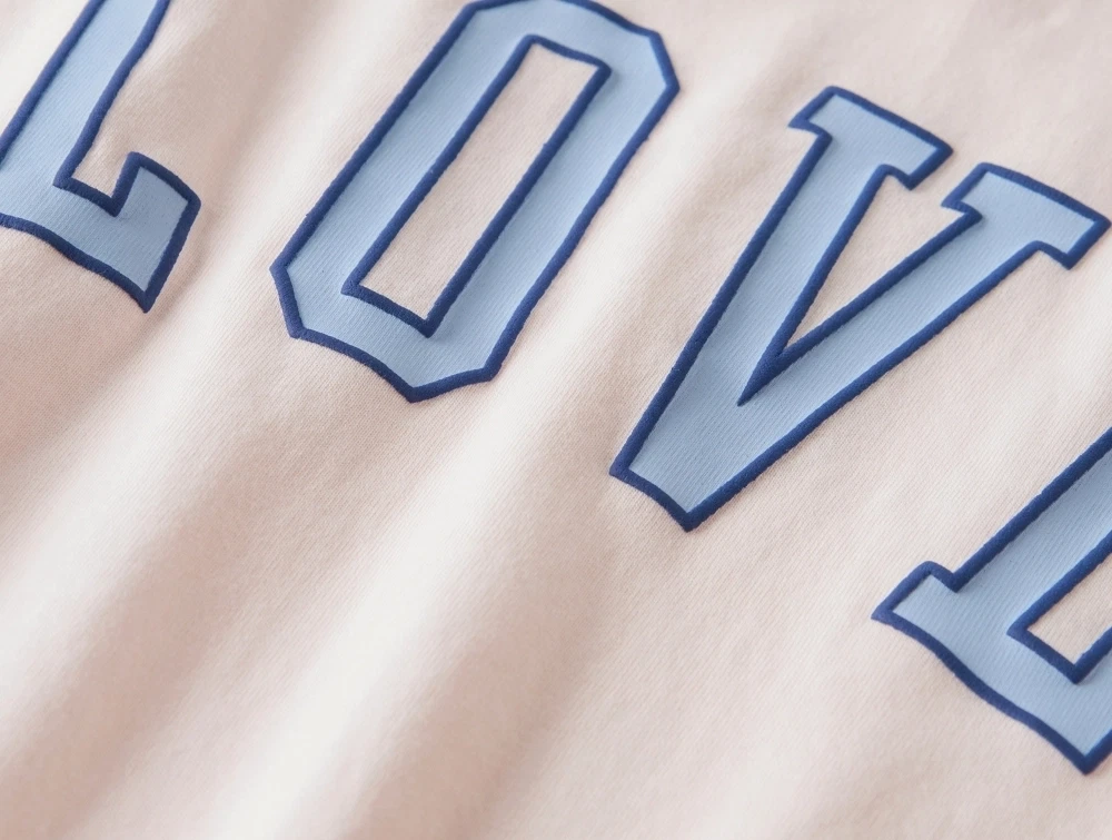Modellen har et stort “LOVE” print på brystet i blå bogstaver og er lavet i blød, økologisk bomuld med rund hals og korte ærmer.