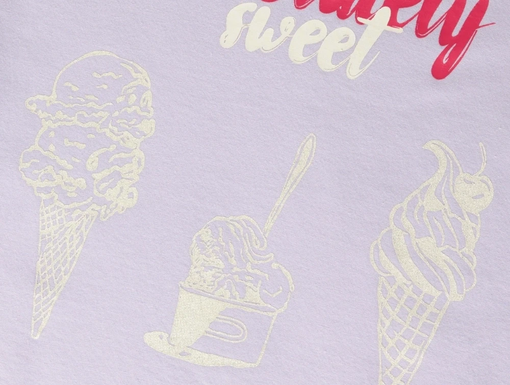 Modellen har korte ærmer, rund hals og stort print foran med teksten “absolutely sweet” samt motiver af is.