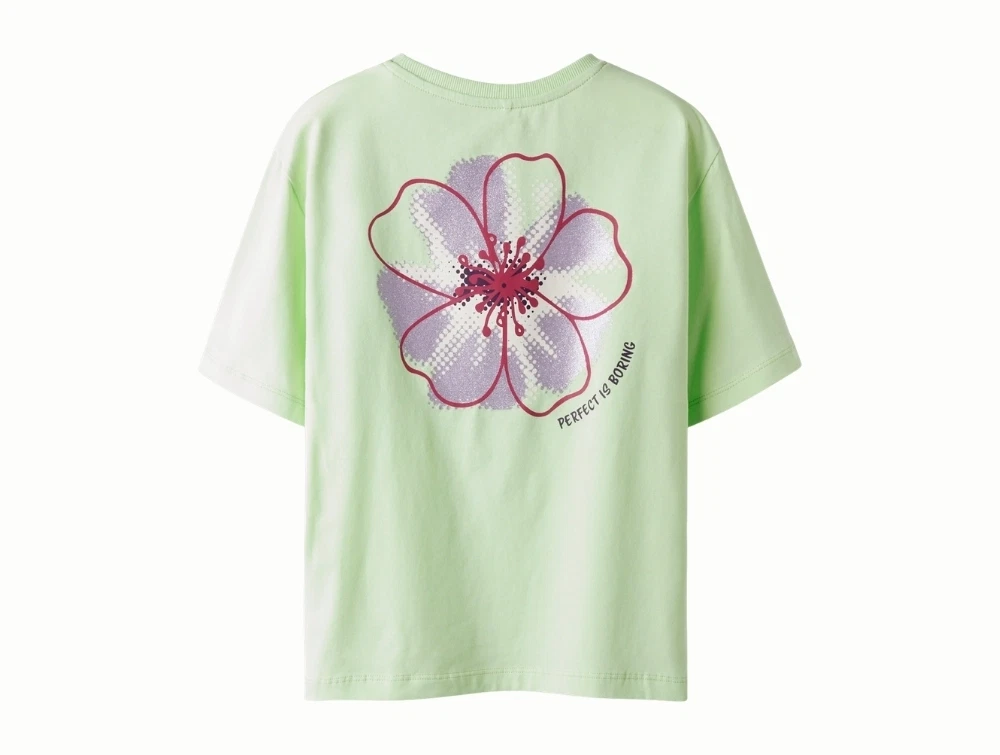 Name It t-shirt i lysegrøn nuance patina green med blomsterprintName It t-shirt i lysegrøn nuance patina green set på modelName It t-shirt i lysegrøn nuance patina green med stort blomsterprint bagpåName It t-shirt i lysegrøn nuance patina green set bagfra
