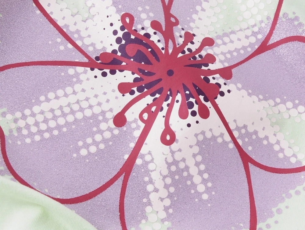 Designet har almindelig pasform og et markant grafisk udtryk i lilla og pink nuancer.