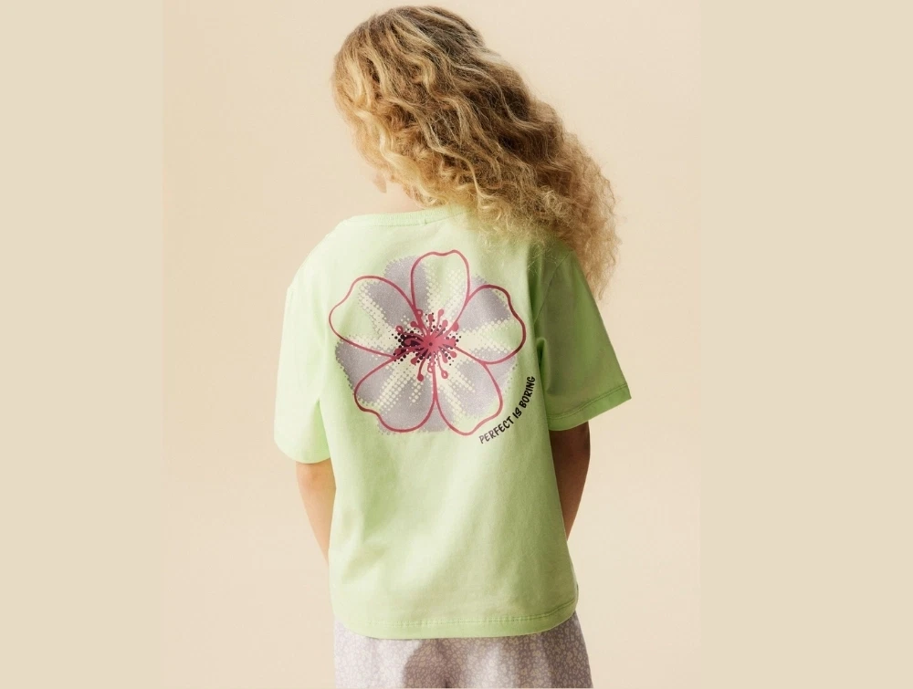 Modellen har korte ærmer, rund hals og lille blomsterprint foran samt stort blomsterprint på ryggen med teksten “perfect is boring”.