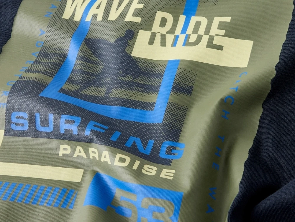 Modellen har korte ærmer, rund hals og lille “wave ride” print foran samt stort grafisk surfmotiv på ryggen.
