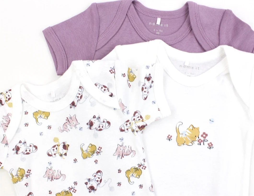 Pakken indeholder 1 ensfarvet lilla body, 1 hvid body med katteprint og 1 hvid body med all-over katteprint.